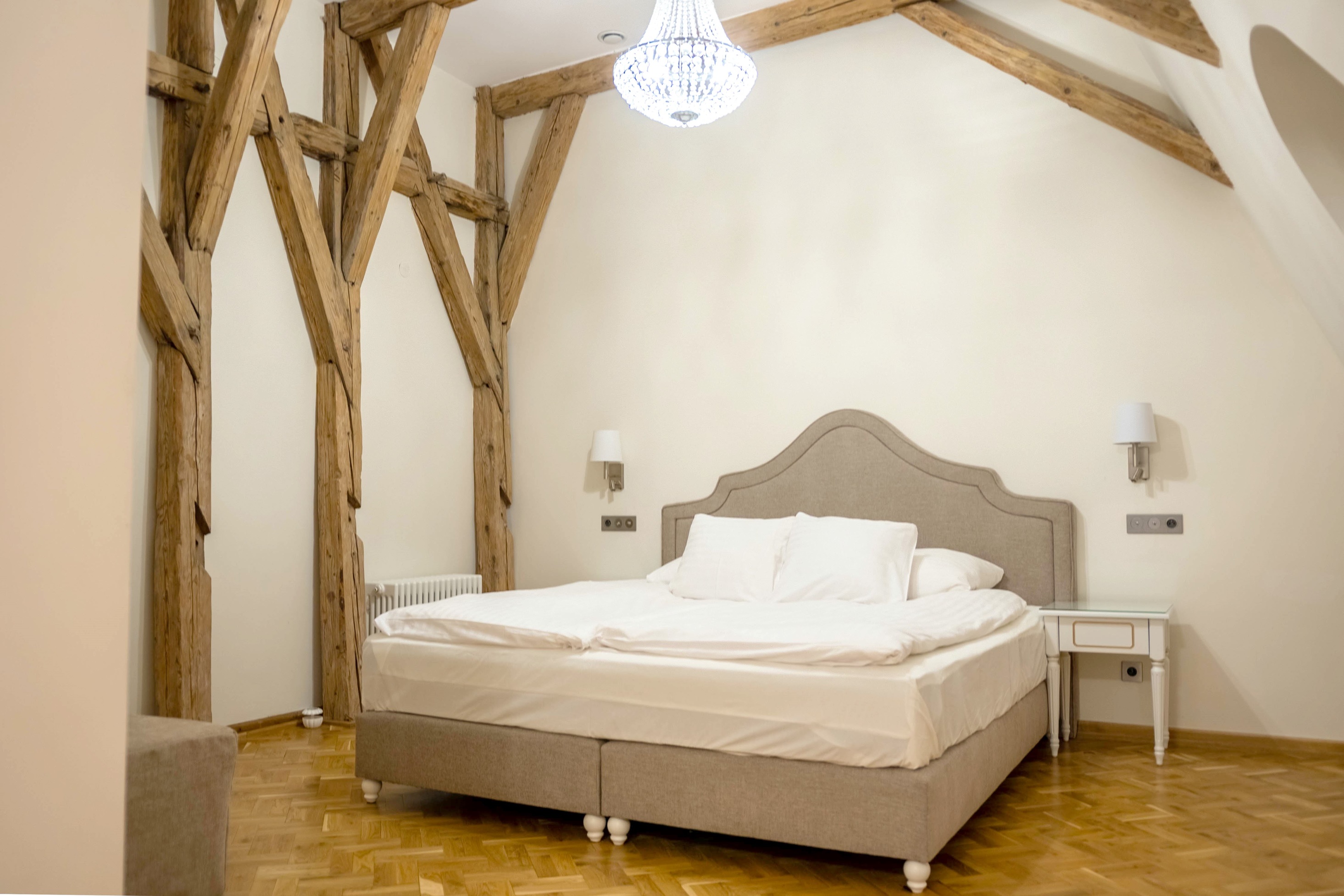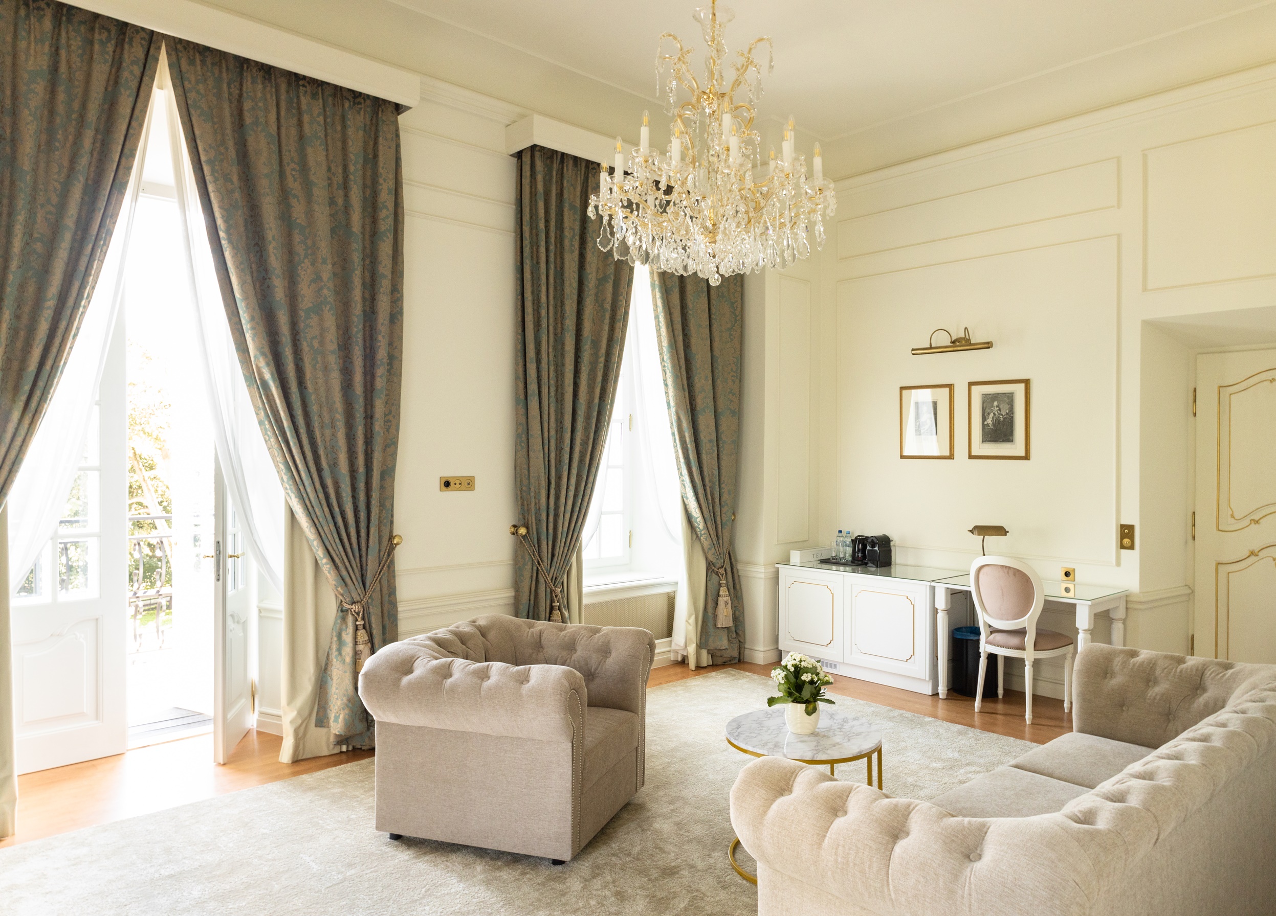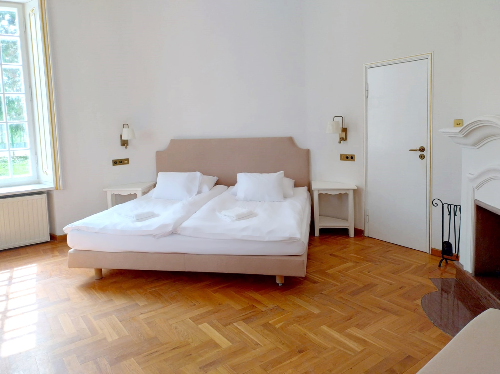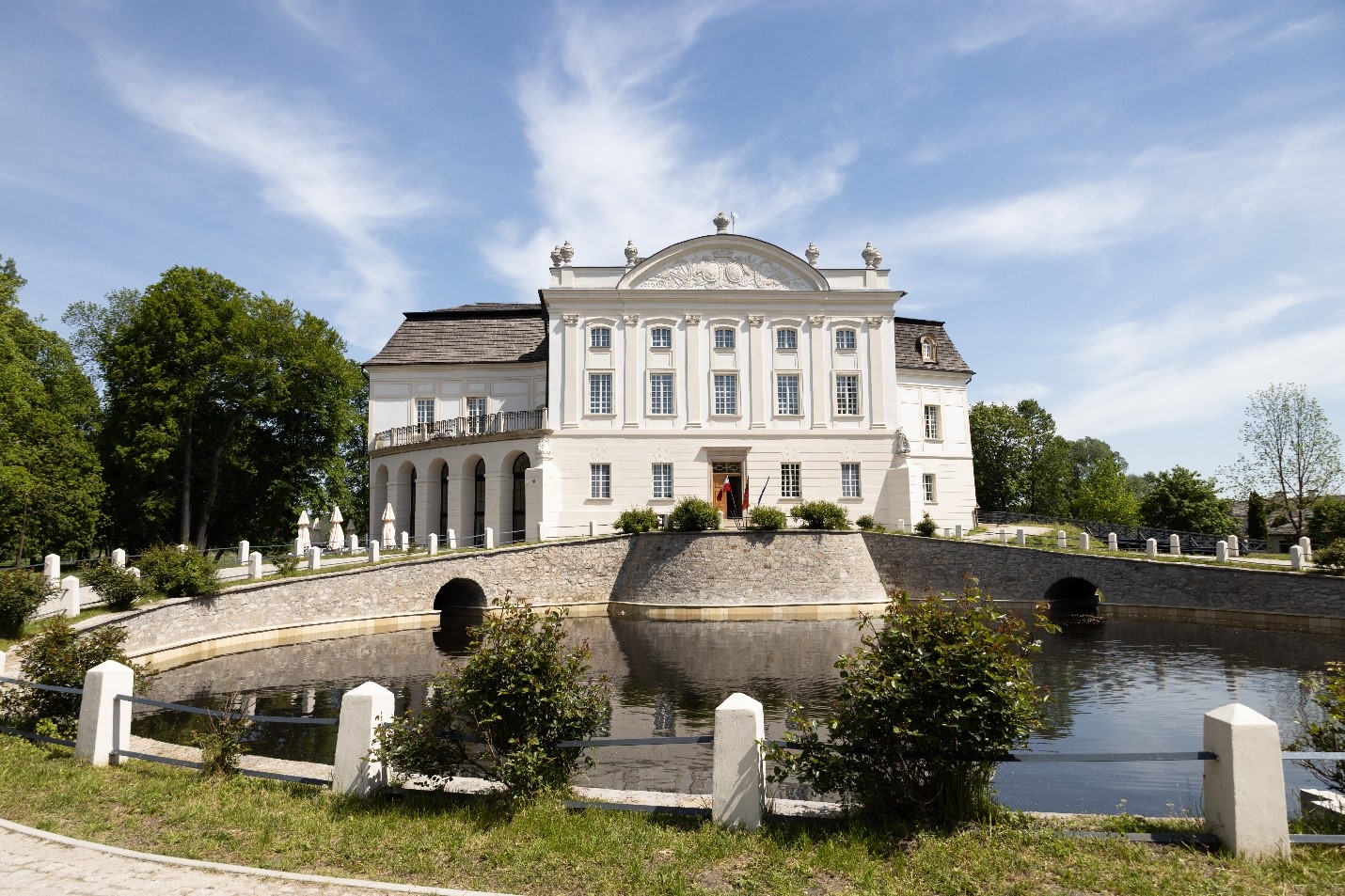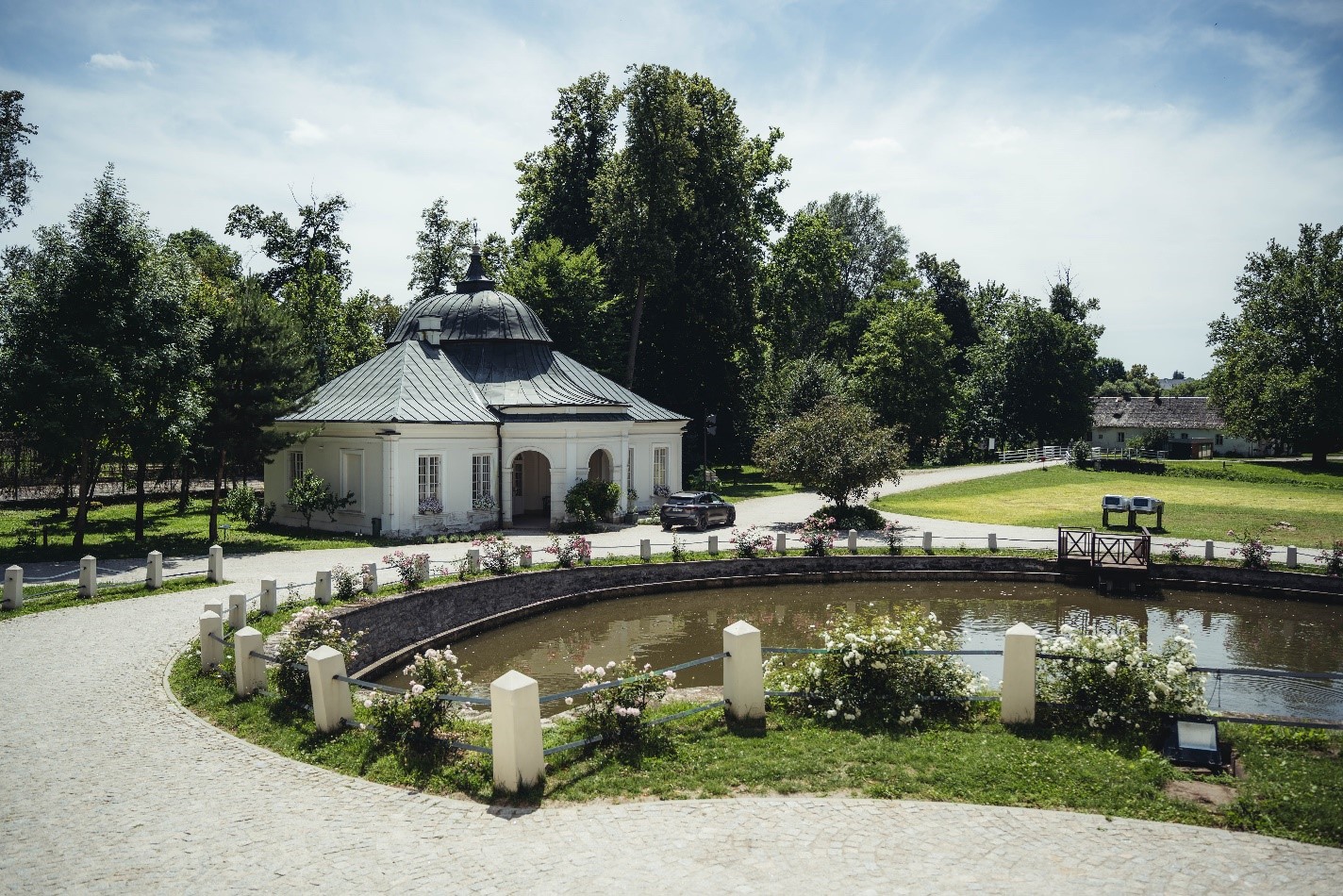 Ende des 18. Jh. wurde sie vollständig im barocken und klassizistischen Stil zu einer vom malerischen Park umgebenen Schlossanlage umgestaltet. Man kann hier die Schlossinnenräume besichtigen und im stilvollen Ambiente übernachten. Eine originelle Attraktion bilden die hier gezüchteten amerikanischen Bisons, man kann auch Gerichte mit Bisonfleisch probieren. Fans der aktiven Freizeitgestaltung können hier Radfahren, ein mehrere Hundert Meter langes Maislabyrinth durchwandern und Tiere im Minizoo besuchen.