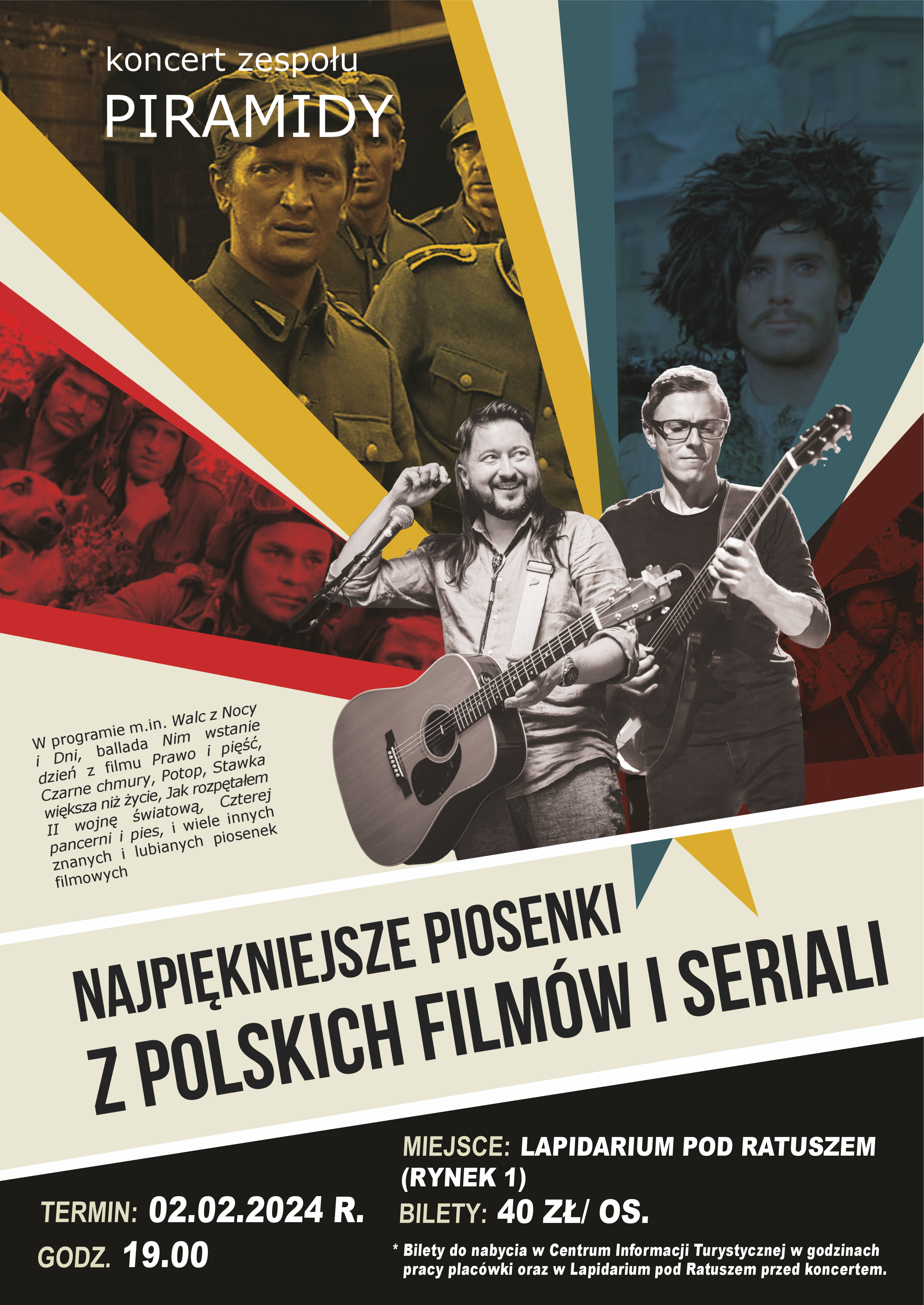 Sandomierskie Centrum Kultury zaprasza na koncert pt. „Najpiękniejsze piosenki z polskich filmów i seriali” w wykonaniu zespołu PIRAMIDY, który odbędzie się w piątek 02.02.2024 roku o godz. 19.00 w Lapidarium pod Ratuszem w Sandomierzu (Rynek 1).