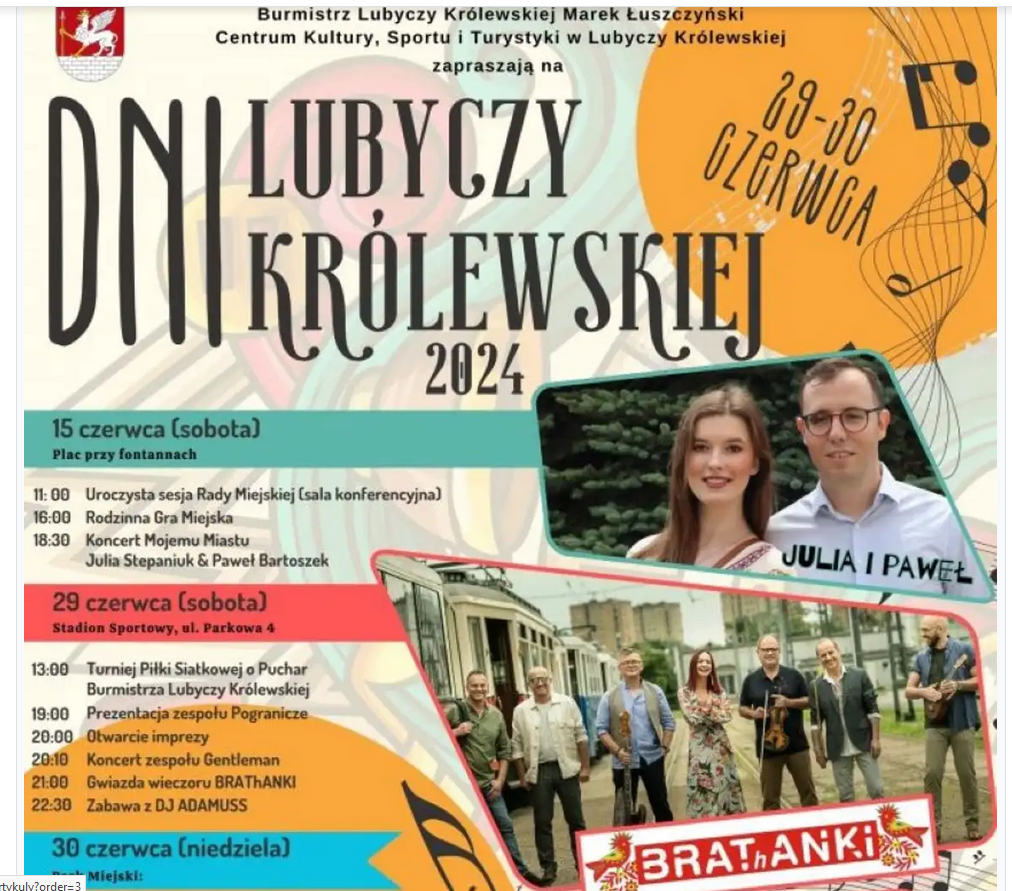 Dni Lubyczy Królewskiej zainaugurowała 15 czerwca uroczysta sesja Rady Miejskiej i kilak innych wydarzeń tego dnia, m.in. rodzinna gra miejska oraz koncert Mojemu Miastu. Miasto będzie świętowało jeszcze dwa dni – 29 i 30 czerwca. W sobotę wybierzcie się więc na stadion sportowy przy ul. Parkowej 4. O godz. 13 rozpocznie się tam Turniej Piłki Siatkowej o Puchar Burmistrza Lubyczy Królewskiej. Od godziny 19 będą koncerty. Najpierw zagra zespół Pogranicze, a po nim i po uroczystym otwarciu imprezy wystąpi zespół Gentleman. O godz. 21 na scenę wyjdzie gwiazda wieczoru zespół Brathanki! Od godz. 22.30 do białego rana zabawę poprowadzi już Dj Adamuss.