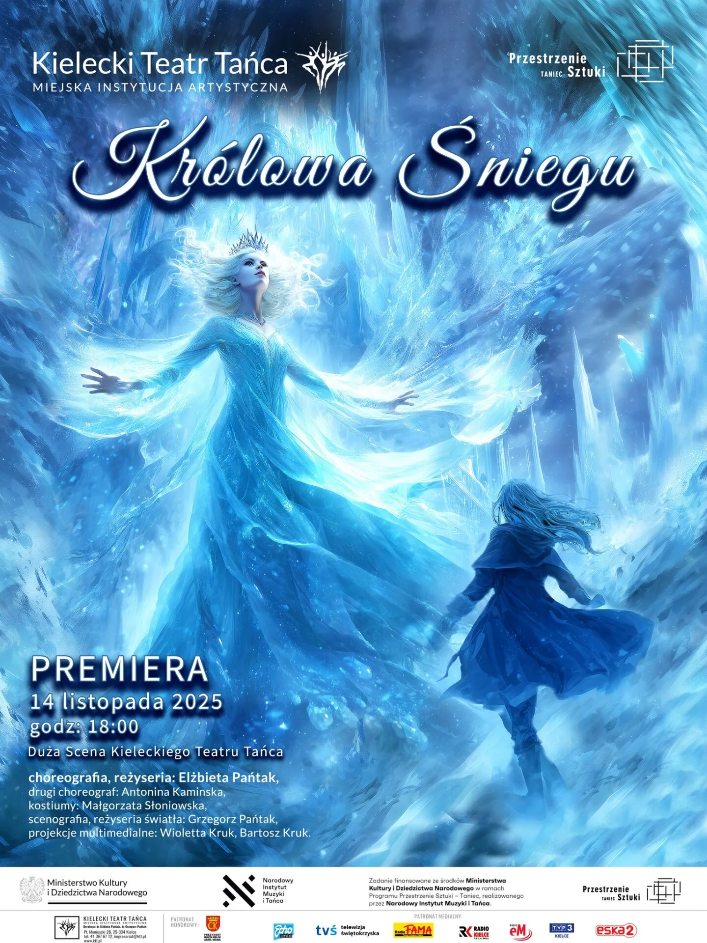 Kielecki Teatr Tańca serdecznie zaprasza na premierę widowiska tanecznego, pt. "Królowa Śniegu", która odbędzie się 14 listopada o godz. 18:00. Premiera realizowana jest w ramach działania pn. "Premiera Dużego Formatu" - programu Przestrzenie Sztuki Taniec 2025.