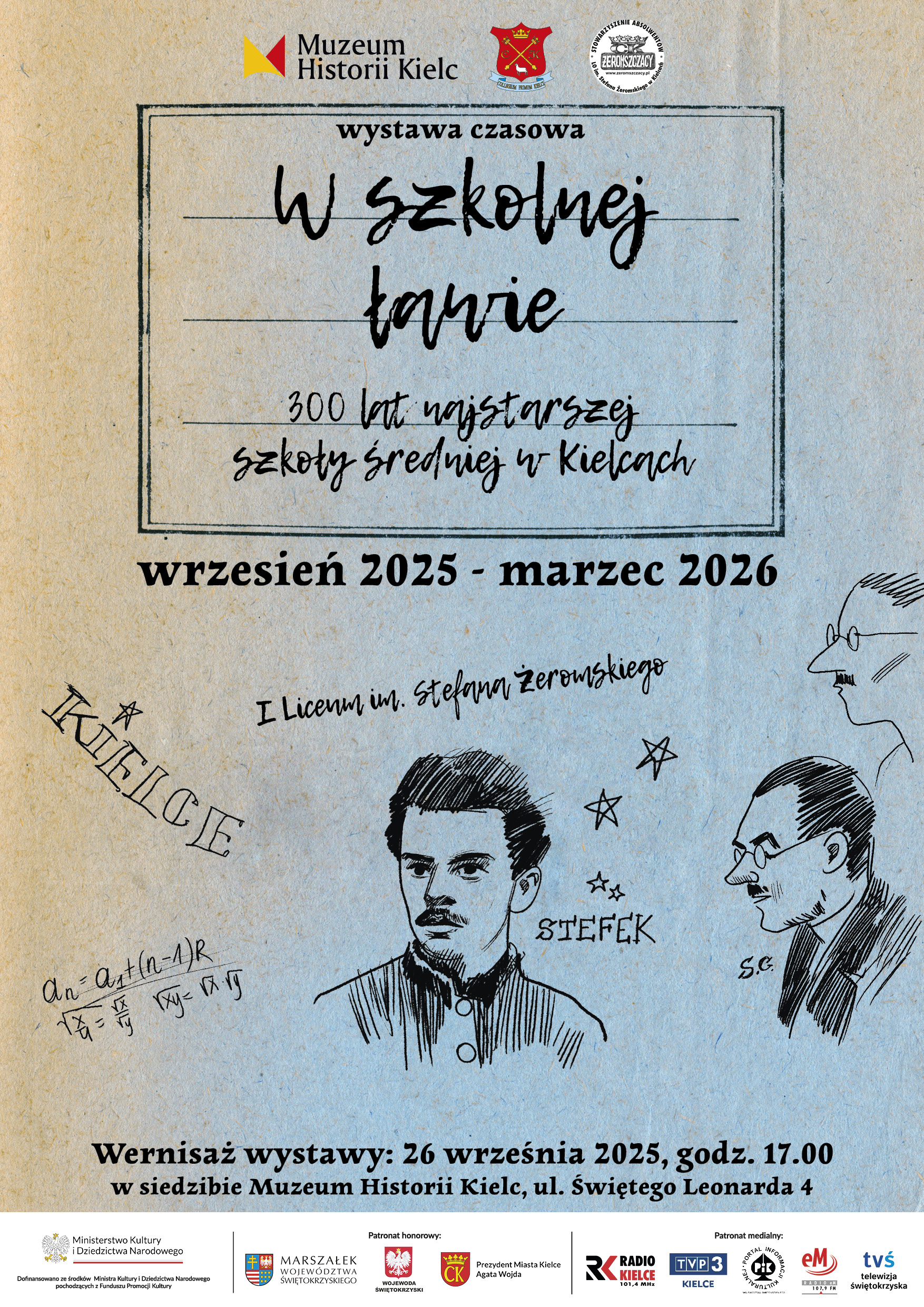 Wystawa „W szkolnej ławie. 300 lat najstarszej szkoły średniej w Kielcach” stanowi istotny element jubileuszowych obchodów 300-lecia I Liceum Ogólnokształcącego im. Stefana Żeromskiego. Została przygotowana we współpracy z I LO oraz Stowarzyszeniem Absolwentów „Żeromszczacy”.